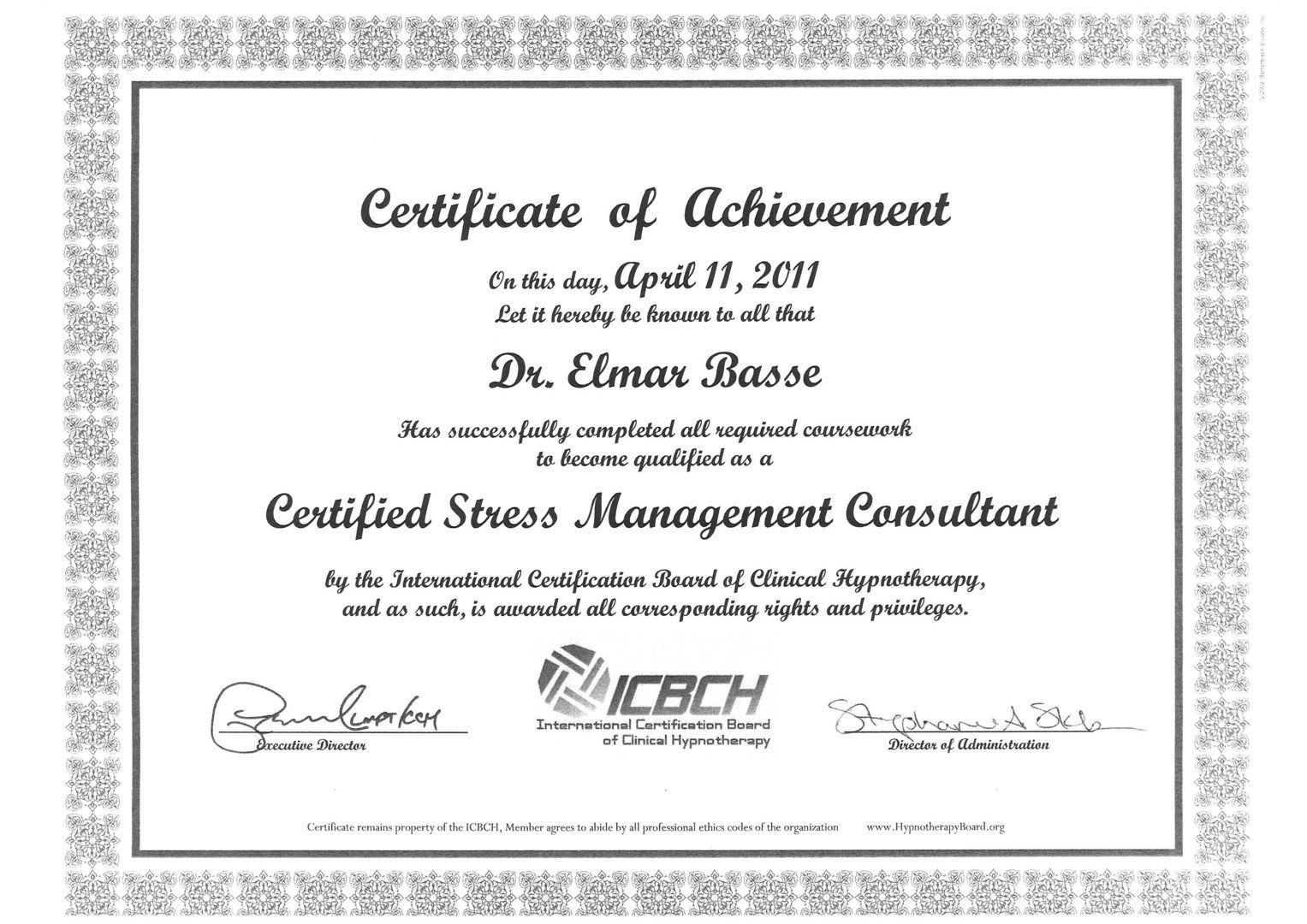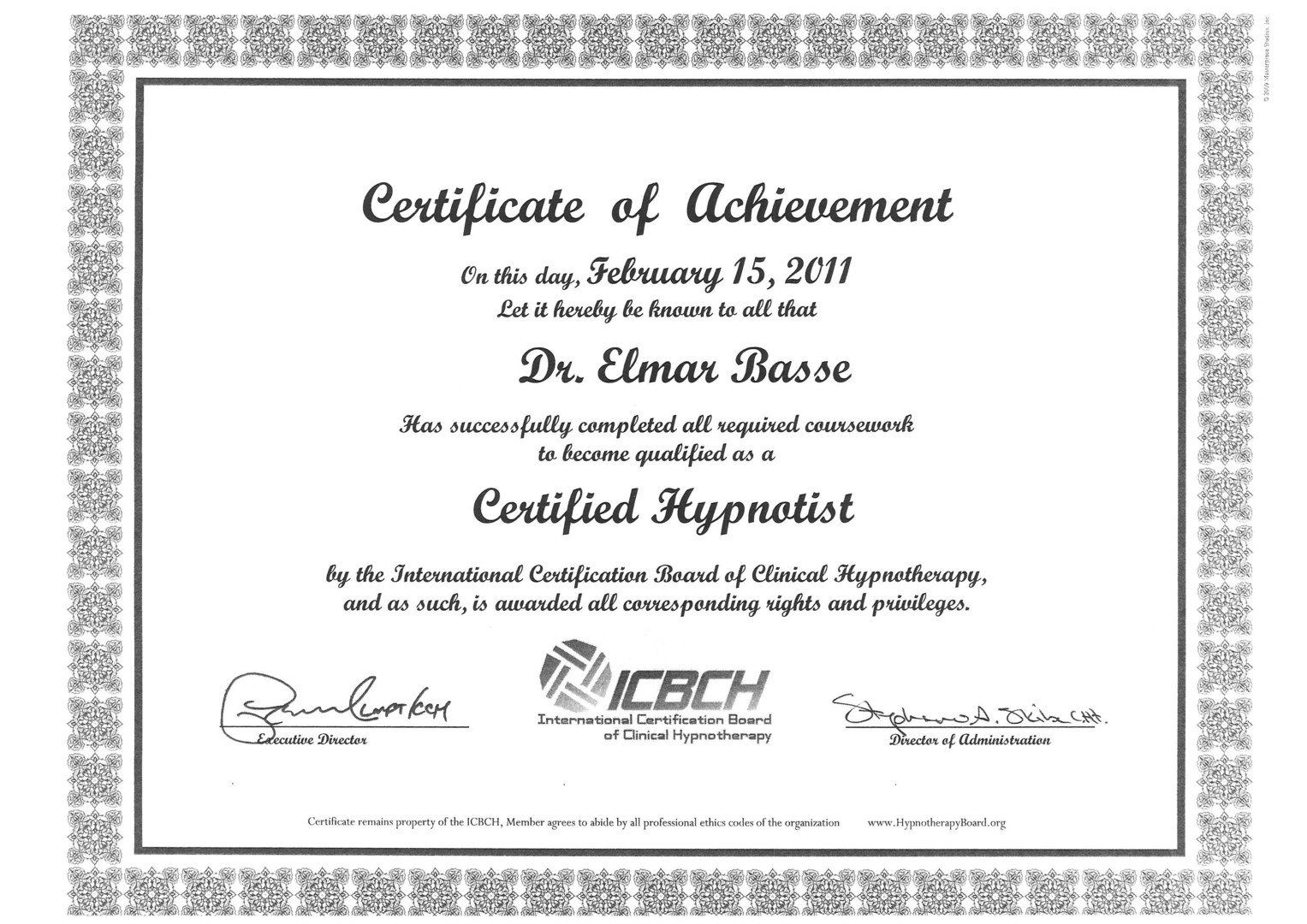 - zertifiziert in Hypnosetherapie durch das ICBCH (International Certification Board of Clinical Hypnotherapy) / Member in Good Standing of the ICBCH